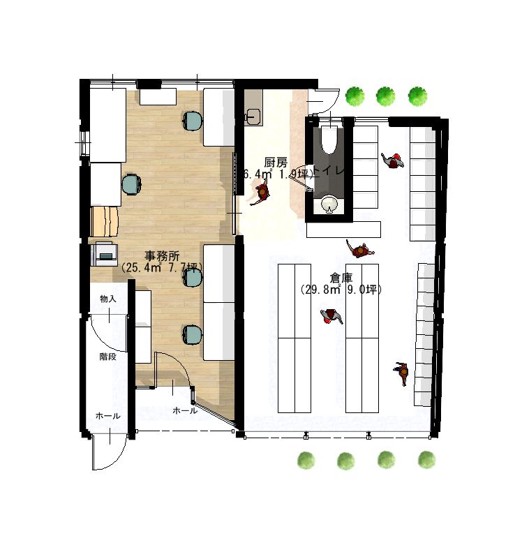 事務所側、倉庫側どちらも広く使いたいので